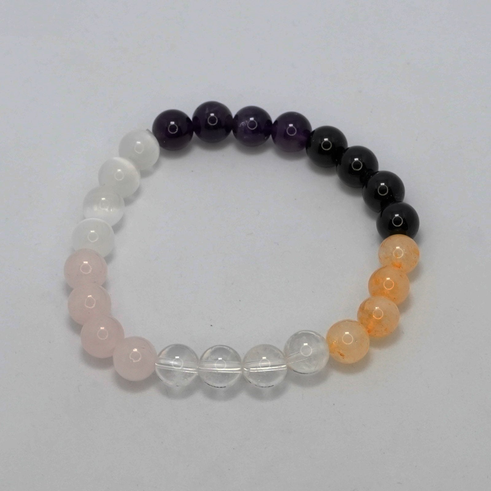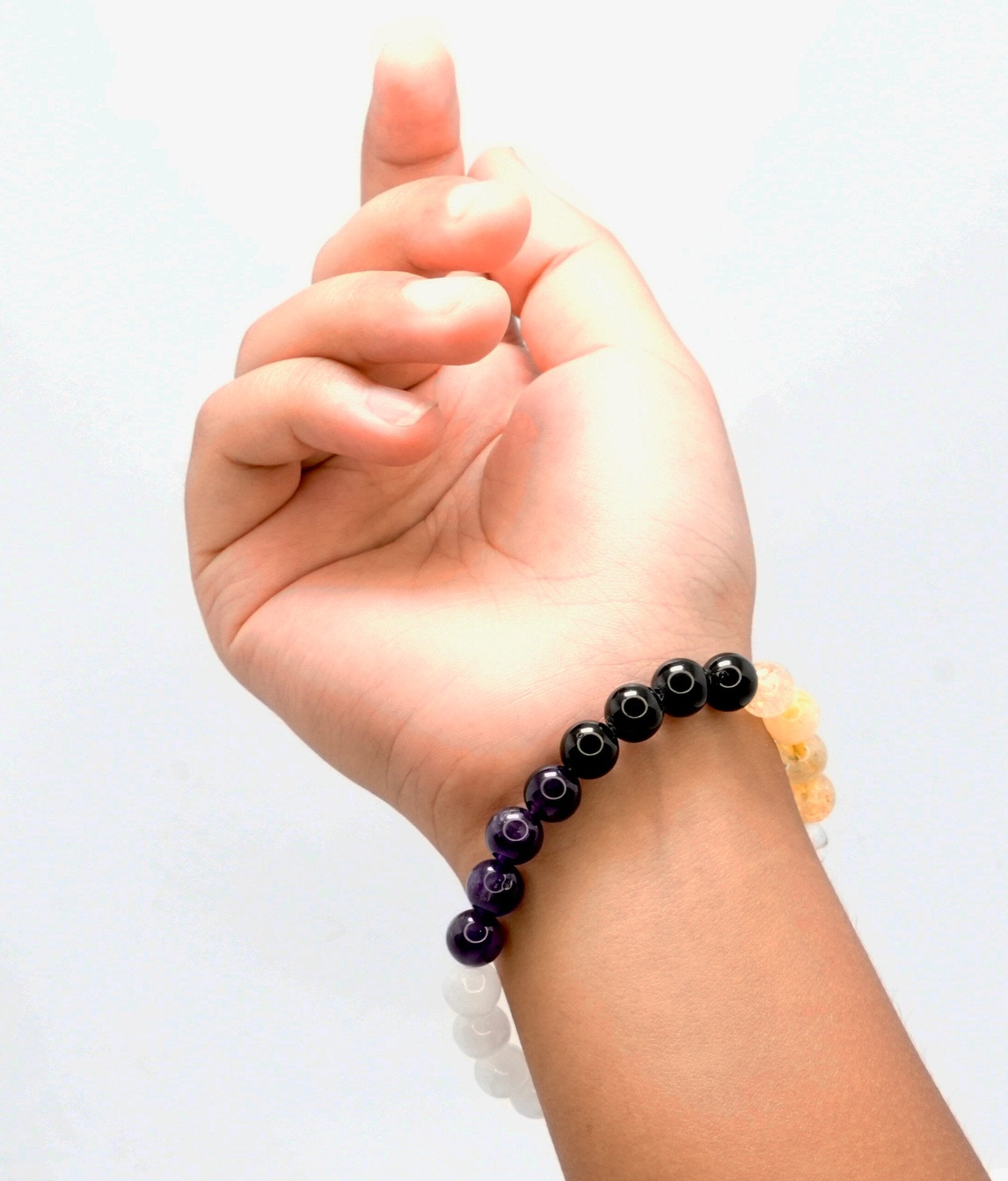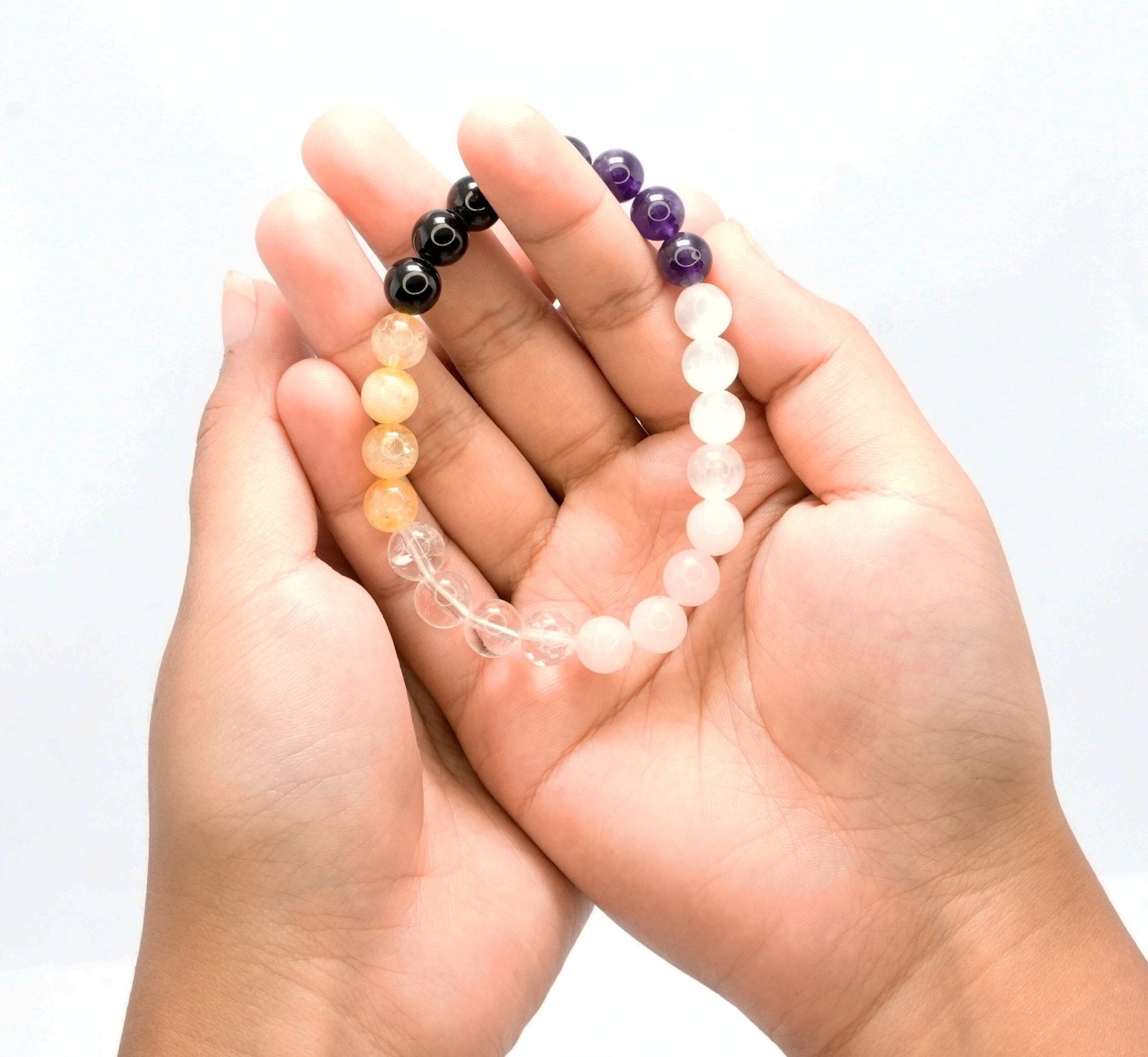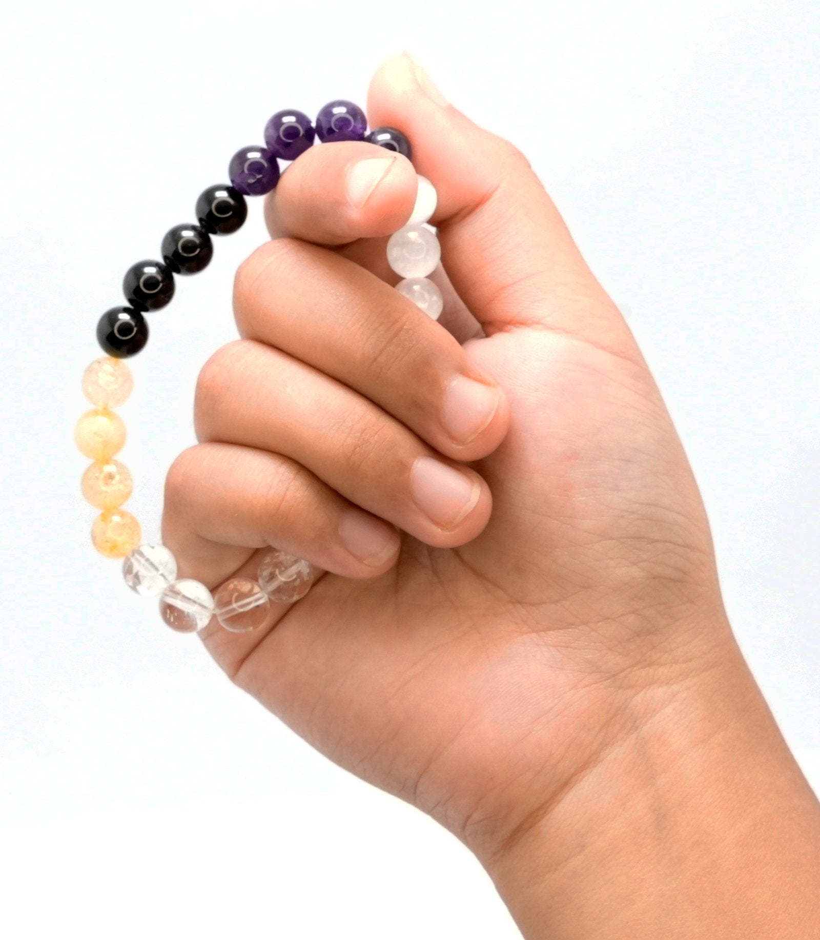 Amethyst: Relieves stress, promotes relaxation, and brings peace and emotional balance for a calm, centered mind. \nBlack Tourmaline: Shields against radiation and negativity, offering protection, grounding energy, and renewed confidence. \nCitrine: Brings happiness and joy, attracts wealth, uplifts the spirit, and aids in releasing physical and emotional toxins. \nSelenite: Cleanses the body, mind, and soul; promotes deep healing, clears stagnant energy, and restores inner harmony. \nRose Quartz: Known as the Love Stone, it encourages forgiveness, opens the heart, and boosts self-love and self-esteem. \nClear Quartz: The Master Healer, it enhances concentration, unlocks memory, amplifies energy, and aligns your intentions with clarity.