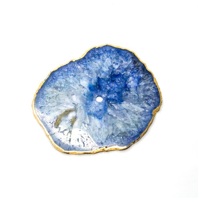 Blue Agate slice induces calm, clarity, and good feelings. Its shades of blue will soothe anyone that has stress or anxieties and encourage clear thinking in his mind. Each piece is one-of-a-kind, perfect for any home, altar, or workspace.
