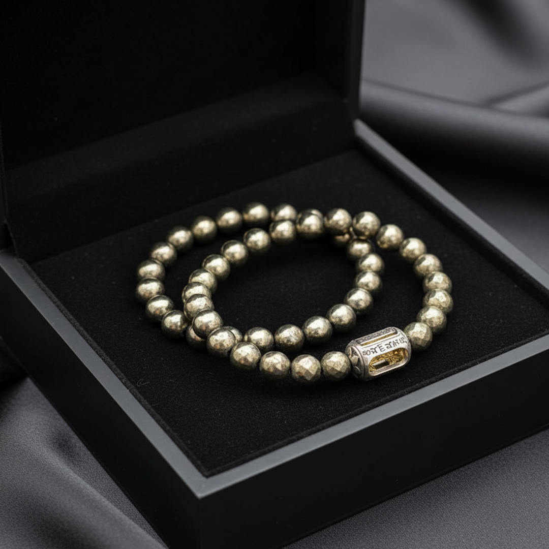 Each bead in this bracelet is crafted from natural Pyrite gemstones, known for their shimmering metallic luster and grounding vibration. Wearing Pyrite helps boost self-confidence, motivation, and creativity — making it an ideal crystal for those pursuing goals, leadership roles, or new business ventures.