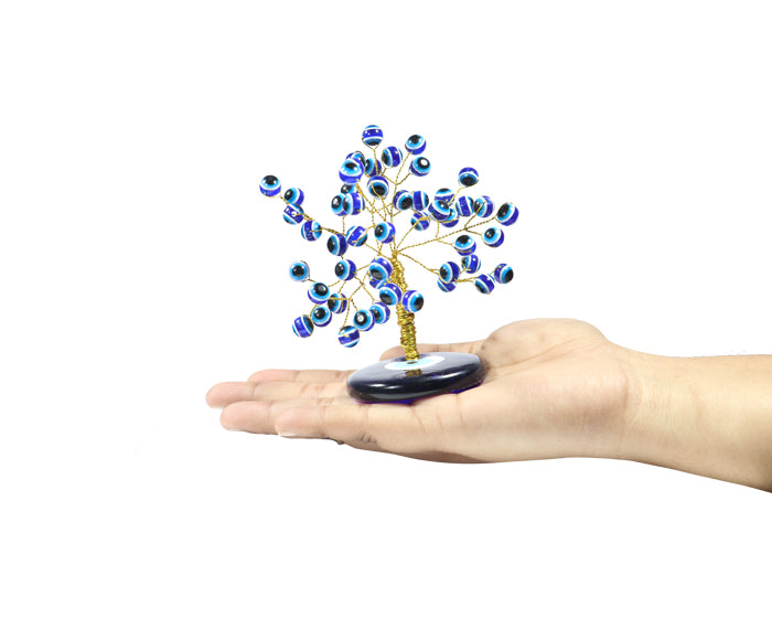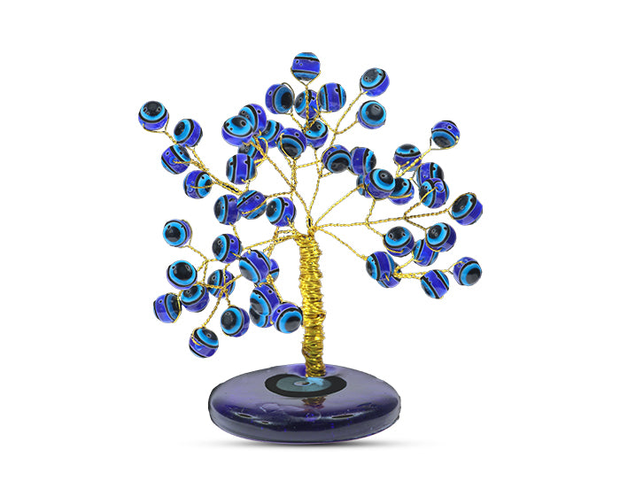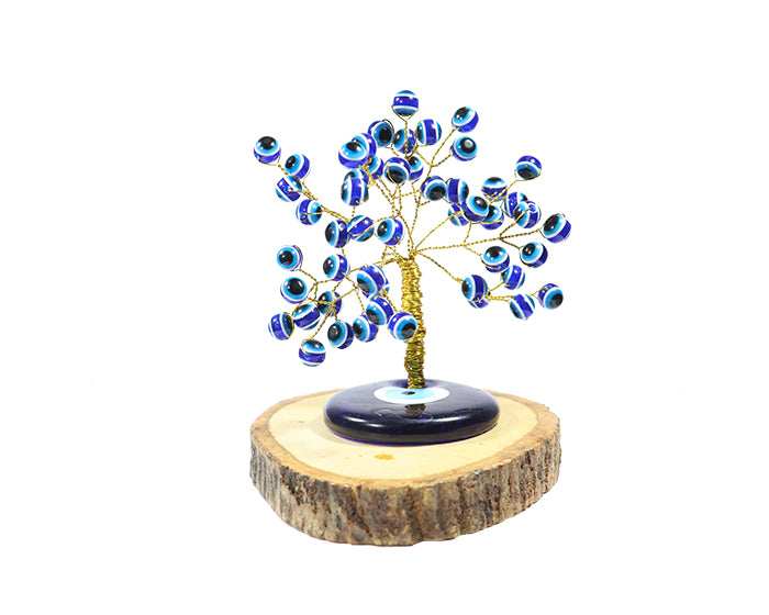 \nThis Evil Eye Tree features multiple evil eye beads arranged on flexible golden wire branches and rooted on a glossy base with a central evil eye. The tree shape adds a touch of growth, strength, and positive flow—while the symbolic beads work to reflect back any negative energy.