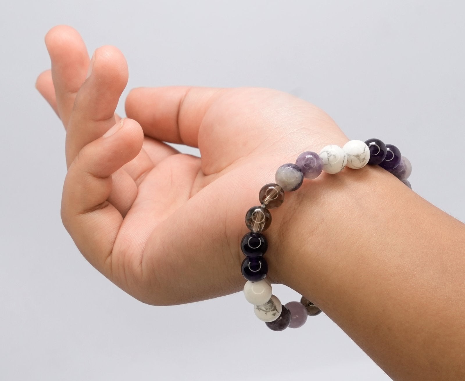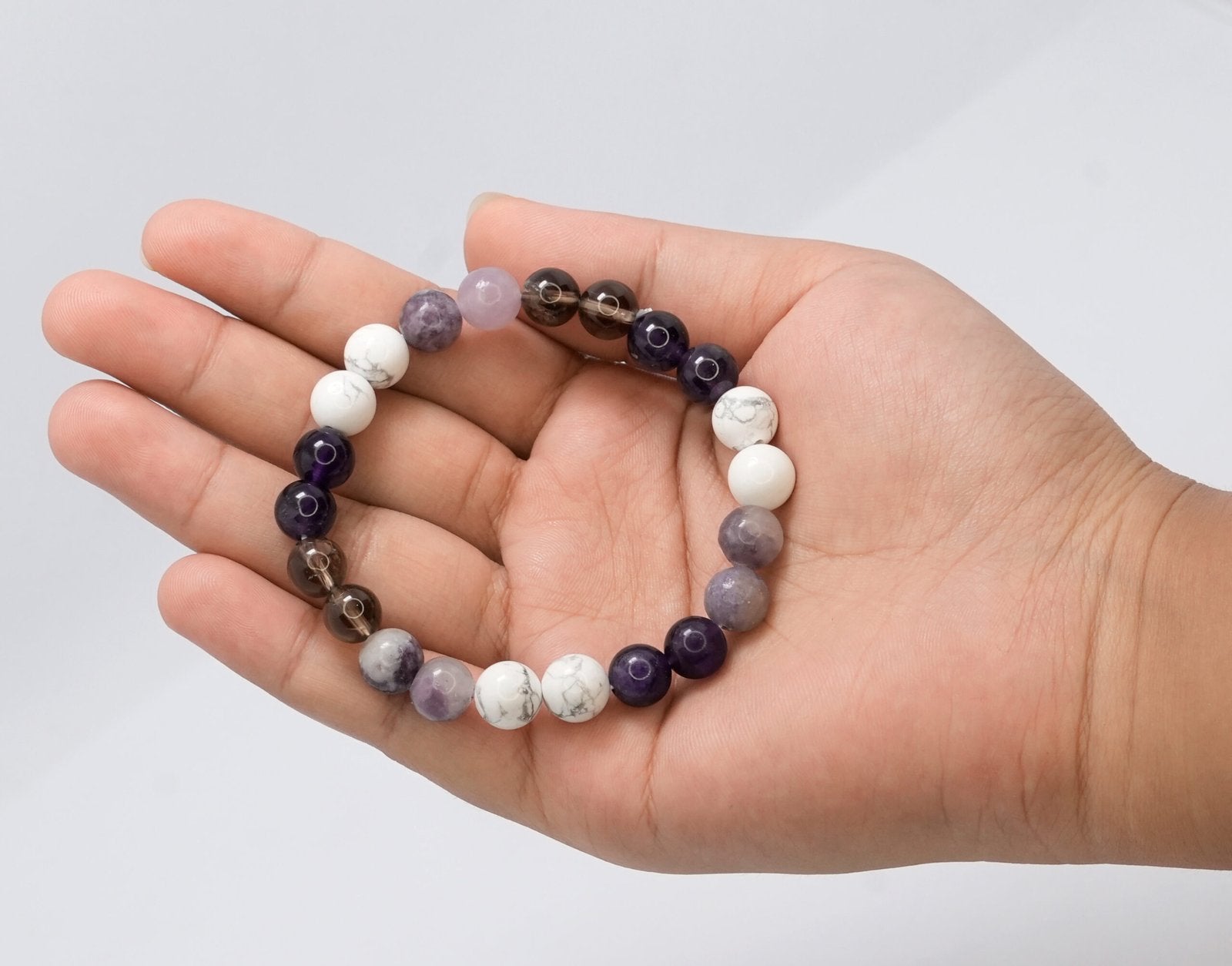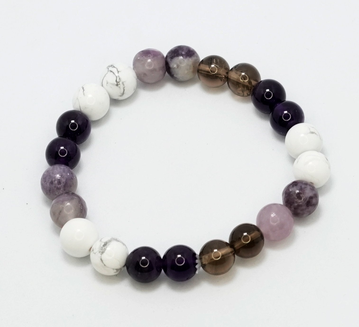 Amethyst: Calms the mind, reduces stress, and aids in peaceful sleep by easing overactive thoughts. \n \nSmoky Quartz: Dispels nightmares, reduces anxiety, and grounds your energy for deep sleep. \n \nLepidolite: Contains lithium to relieve stress, ease insomnia, and encourage deep relaxation \n \nHowlite: Calms overthinking, promotes mindfulness, and reduces insomnia with its tranquil energy. \n \n \n \nThis is just a spiritual support - its not meant to replace any medical advice or treatment. \n \n