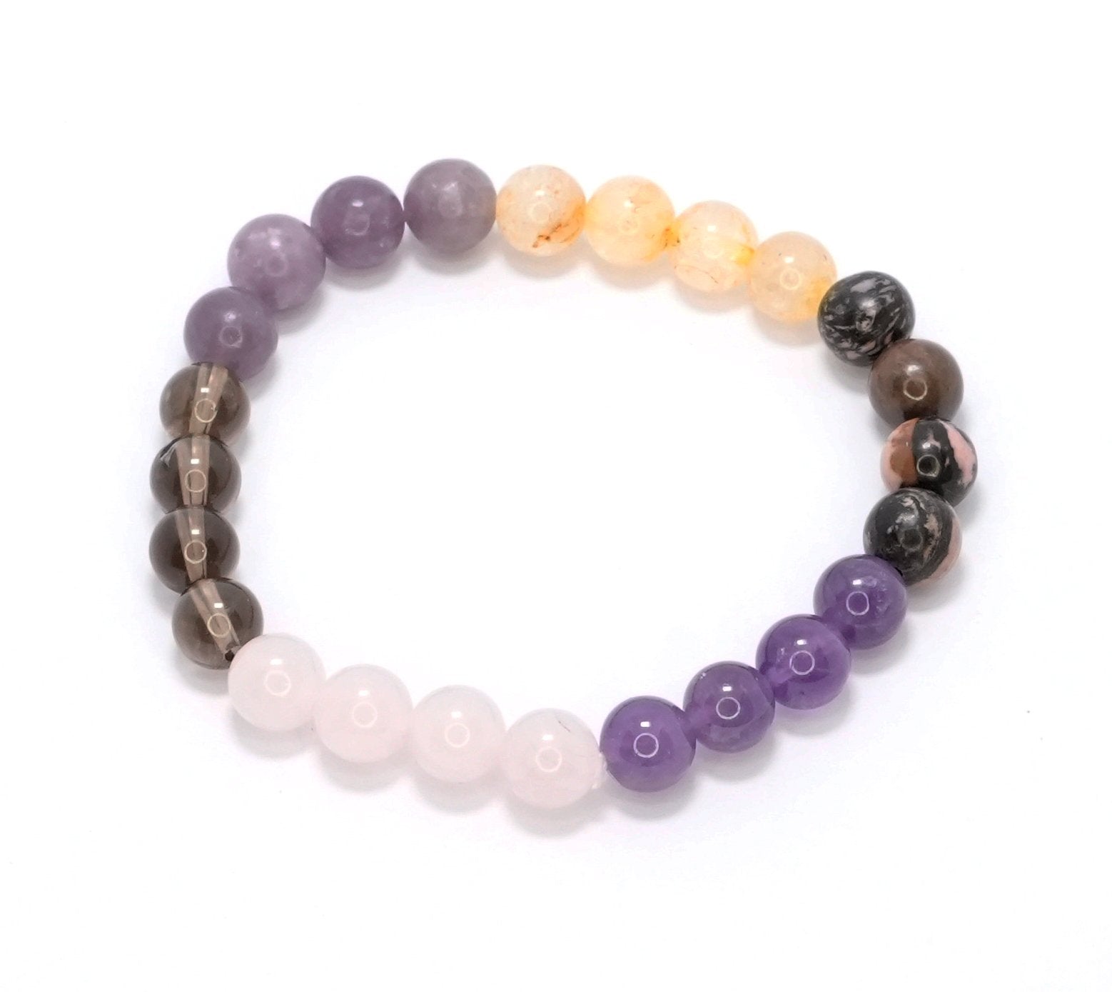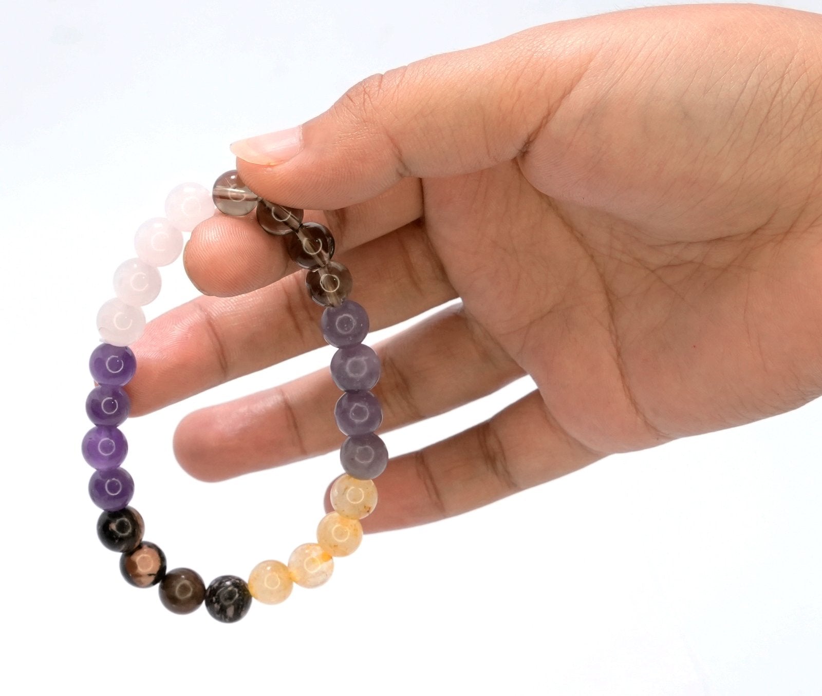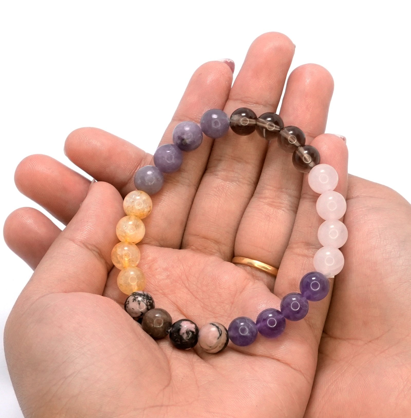 Amethyst: Brings a Sense of Peace and Calm, Helping to Quiet the Mind and Deepen your Spiritual Connection. \n \nRose Quartz: Encourages Self-Love and Emotional Healing, Opening the Heart to Compassion and Inner Harmony. \n \n Smoky Quartz: Dispels Negative Energy, Grounds your Emotions, and Promotes Emotional Stability and Resilience. \n \nRhodonite: Supports Healing from Emotional Pain and Fosters Compassion, Forgiveness, and Self-Worth. \n \nCitrine: Inspires Joy, Boosts Confidence, and fills your Space with Bright, Uplifting, and Positive Energy. \n \nLepidolite: Relieves Anxiety and Emotional Tension, Promoting Calm, Clarity, and a Sense of Emotional Support. \n \n  \n \nThis is just a spiritual support - its not meant to replace any medical advice or treatment. \n \n  \n \n