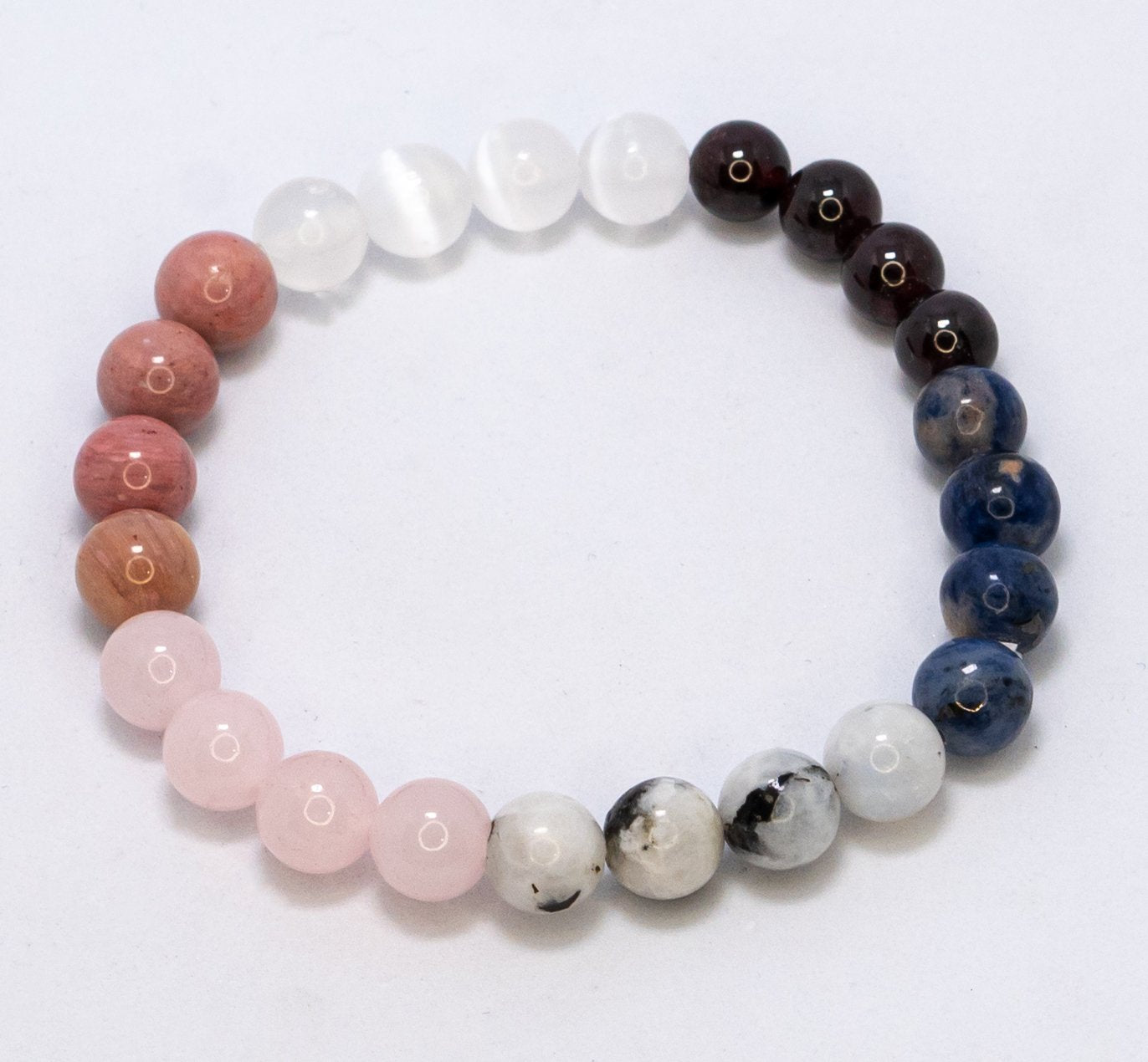 Garnet: It is a crystal attracting everlasting love enhancing our vitality and endurance. \n \nMoon Stone: Stone awakens love not only for the other person but also for yourself. \n \nRhodochrosite: Associated with the heart chakra, this crystal makes you lively, loving, positive \n \nSodalite: It will aid the truth and give you a better understanding of life, living, love and loving. \n \nSelenite: Dissolving distractions and transforming negative energy into hope, love \n \nRose Quartz: Also known as a romantic stone, rose quartz can also be used to attract love. \n \n \n \nThis is just a spiritual support - its not meant to replace any medical advice or treatment. \n \n