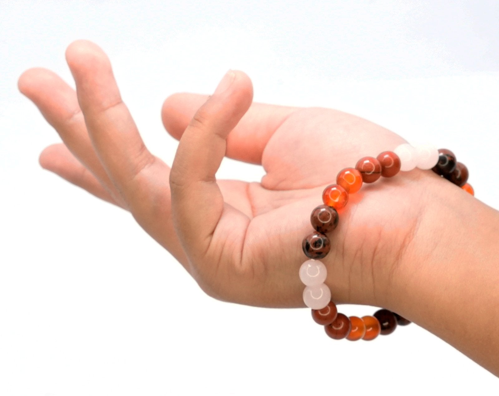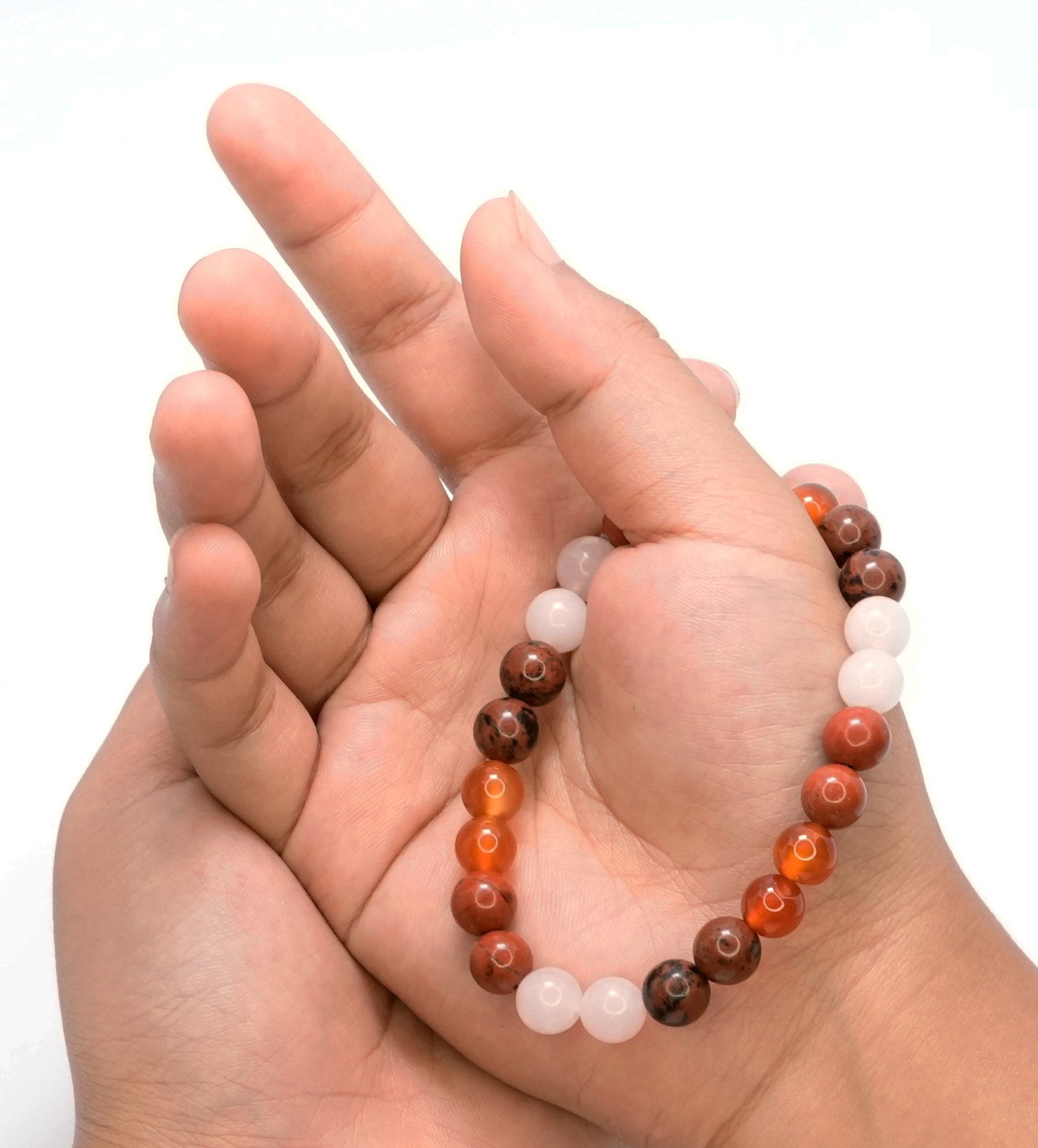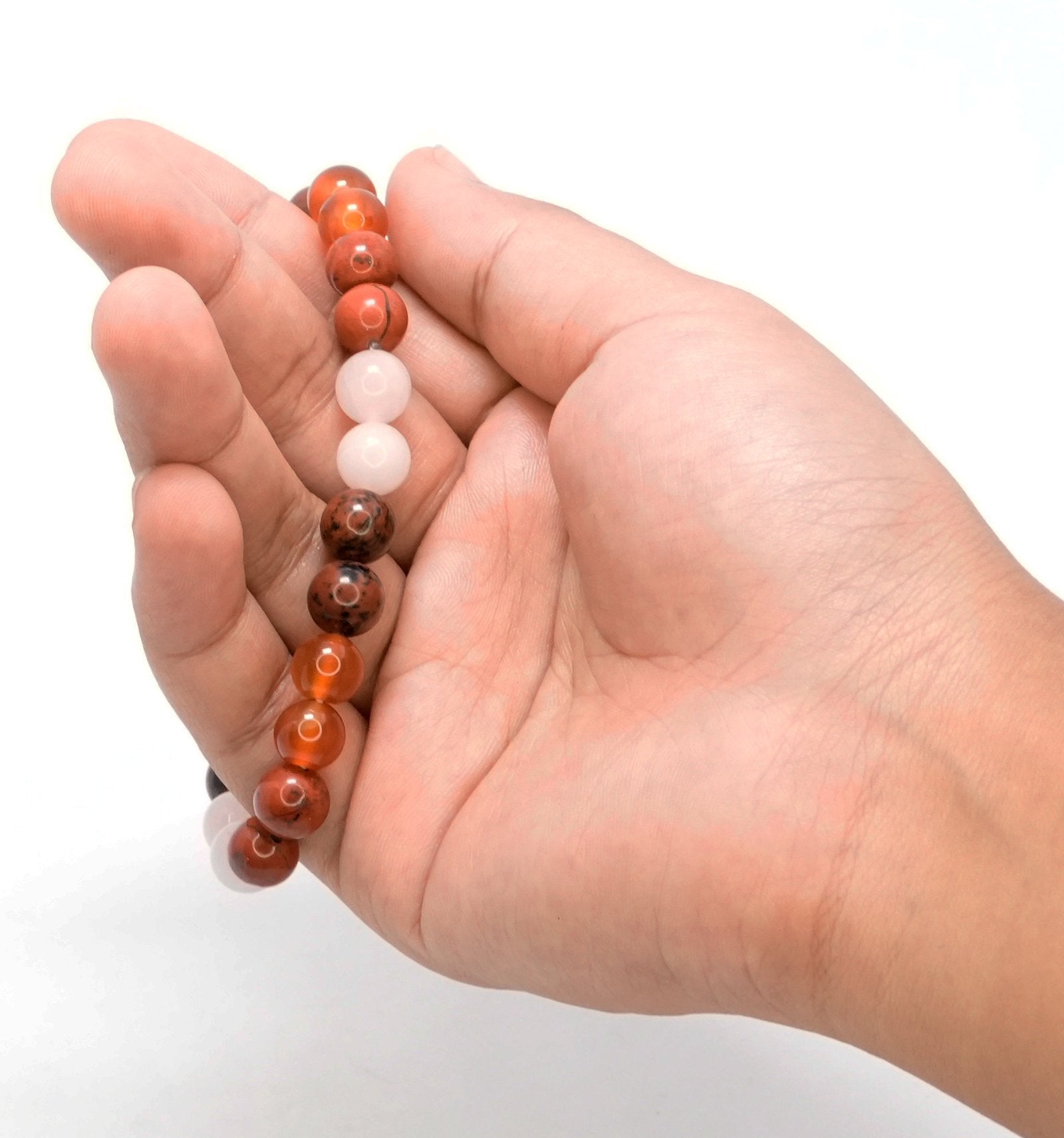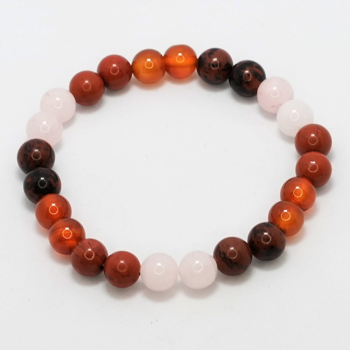 Carnelian: Boosts motivation, courage, vitality enhances creativity, overcomes self-doubt. \n Rose Quartz: Encourages self-love, compassion, healing restores peace, balances relationships. \n Mahogany Obsidian: Enhances grounding, protection, healing supports emotional clarity. \n Red Jasper: Enhances stability, energy, healing balances lifes challenges.