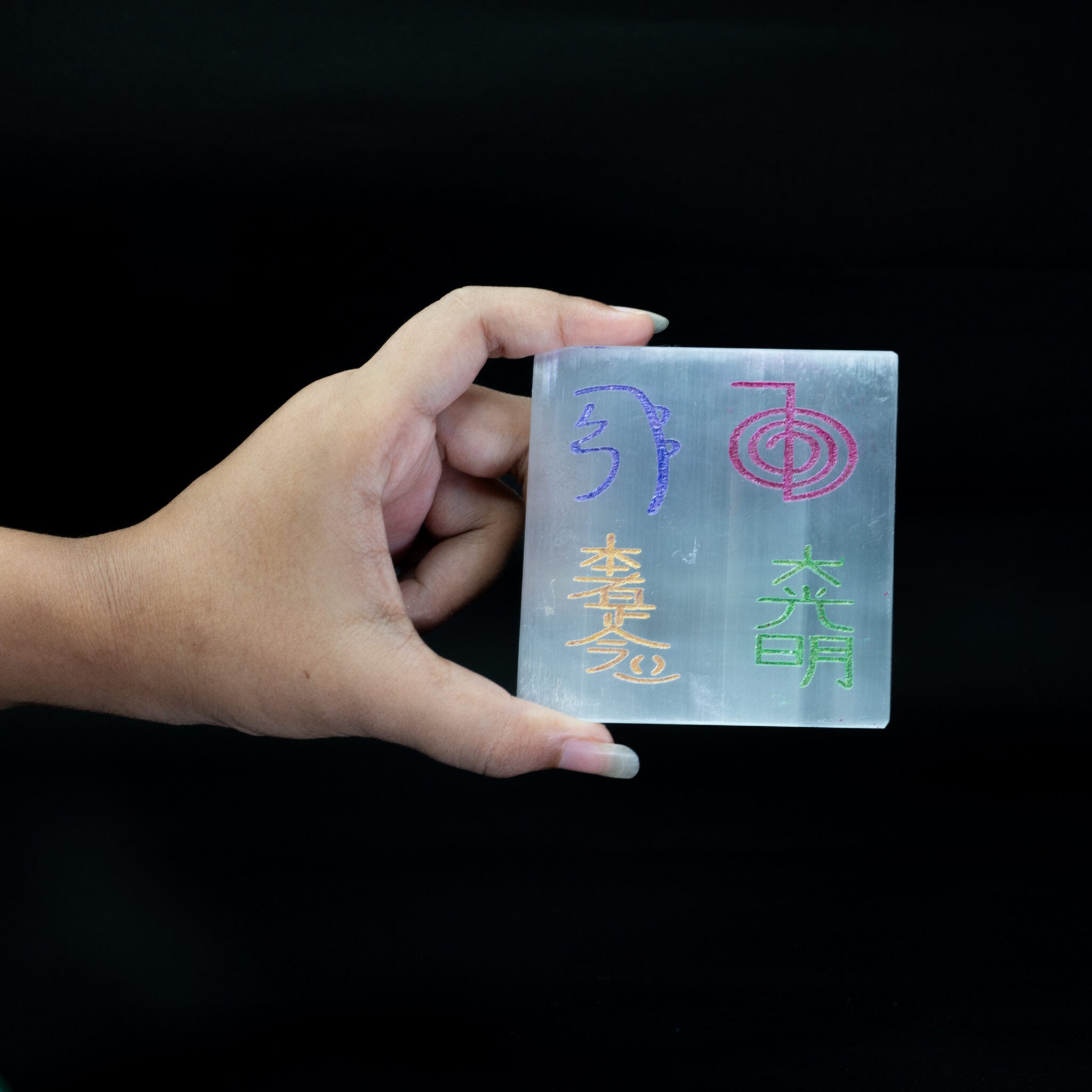 Selenite is widely known as the stone of spiritual cleansing and light. It holds a high vibrational energy that clears negativity and brings peace, making it a perfect match for healing work. When combined with sacred Reiki symbols, its power is amplified—supporting emotional release, energy flow, and deep inner balance.Our Reiki Symbols Selenite Plate features beautifully engraved sacred symbols used in Reiki healing, including Cho Ku Rei (power), Sei He Ki (emotional balance), and Hon Sha Ze Sho Nen (distance healing). These symbols are not just visually beautiful—they carry centuries of energy healing tradition.Use this plate during Reiki sessions, place it in your healing space, or use it as a tool for meditation, cleansing, or intention setting. It helps in amplifying energy, promoting emotional release, and protecting your aura from negativity.Whether you're a Reiki practitioner or someone seeking emotional and energetic healing, this plate brings clarity, calm, and sacred energy to your space.