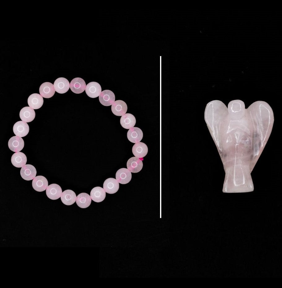 This heart-healing combo combines the soothing energy of a Rose Quartz Bracelet with the gentle presence of a Rose Quartz Angel. Known as the stone of unconditional love, Rose Quartz promotes emotional healing, self-love, harmony, and compassion. Ideal for daily wear and spiritual support, this set invites peace, comfort, and loving vibrations into your life. \n \nOpens heart chakra \n• Encourages self-love and emotional balance \n• Promotes peace, healing & compassion \n• Supports meditation and gentle energy flow