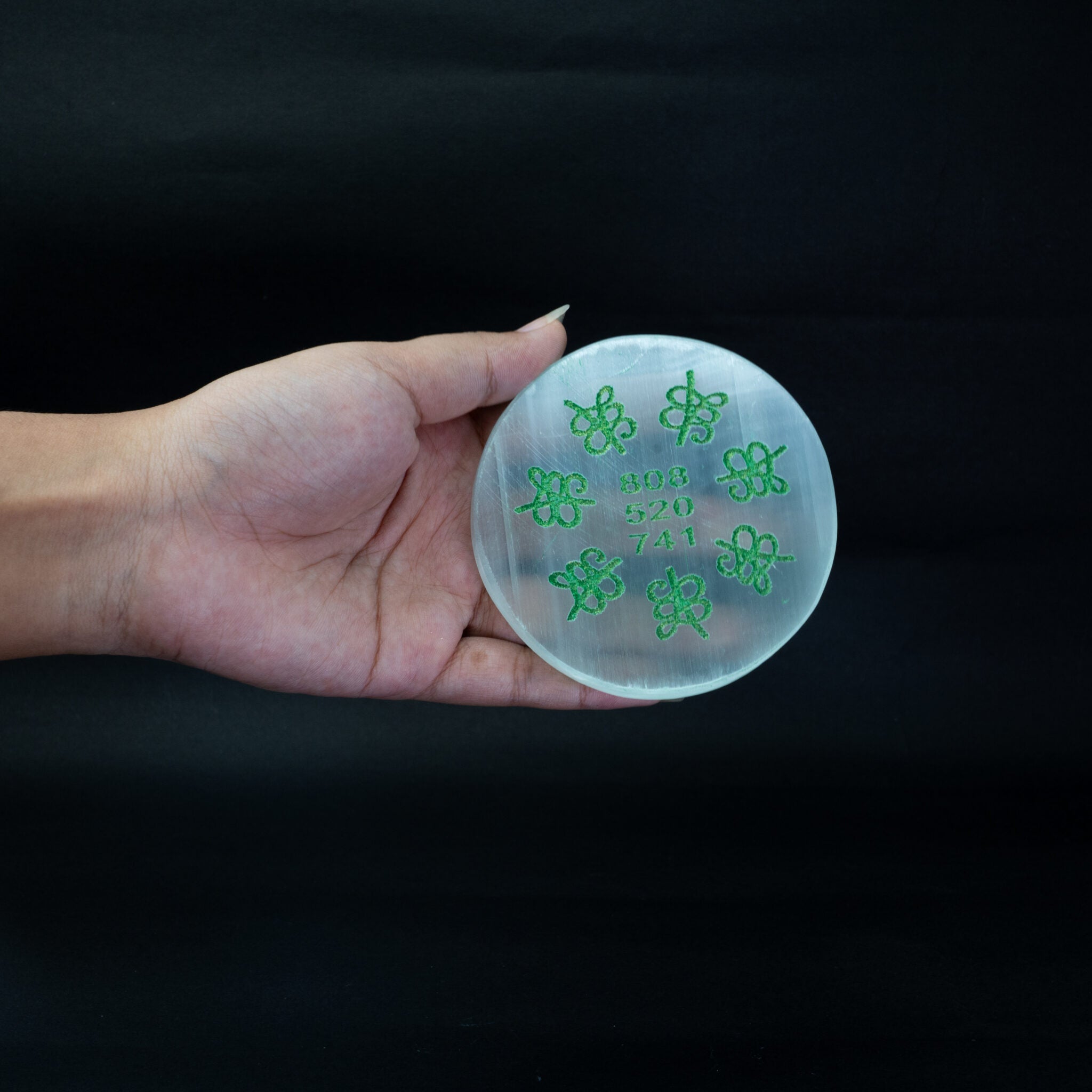 Selenite is known as the stone of purity and high vibration, often used to cleanse energy, clear mental clutter, and create a peaceful space. When paired with sacred codes like 808 520 741, its energy becomes focused toward manifestation—especially attracting money and abundance.This Round Grabovoi Code Selenite Plate is a sacred blend of energy and intention. The round shape allows energy to flow in all directions, while the engraved code channels the vibration of prosperity. Surrounded by healing symbols, this piece is ideal for rituals, affirmations, and spiritual work.Place it under your manifestation journal, wallet, crystals, or in your workspace. Use it during meditation or while repeating affirmations. Whether you’re calling in wealth or clearing blocks around abundance, this plate supports your journey with clarity and alignment.