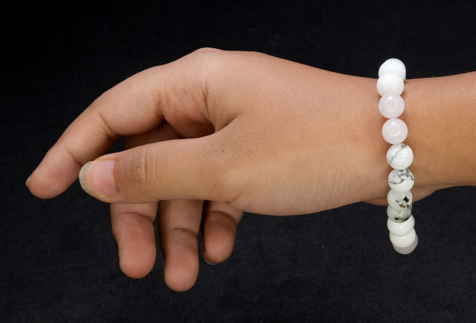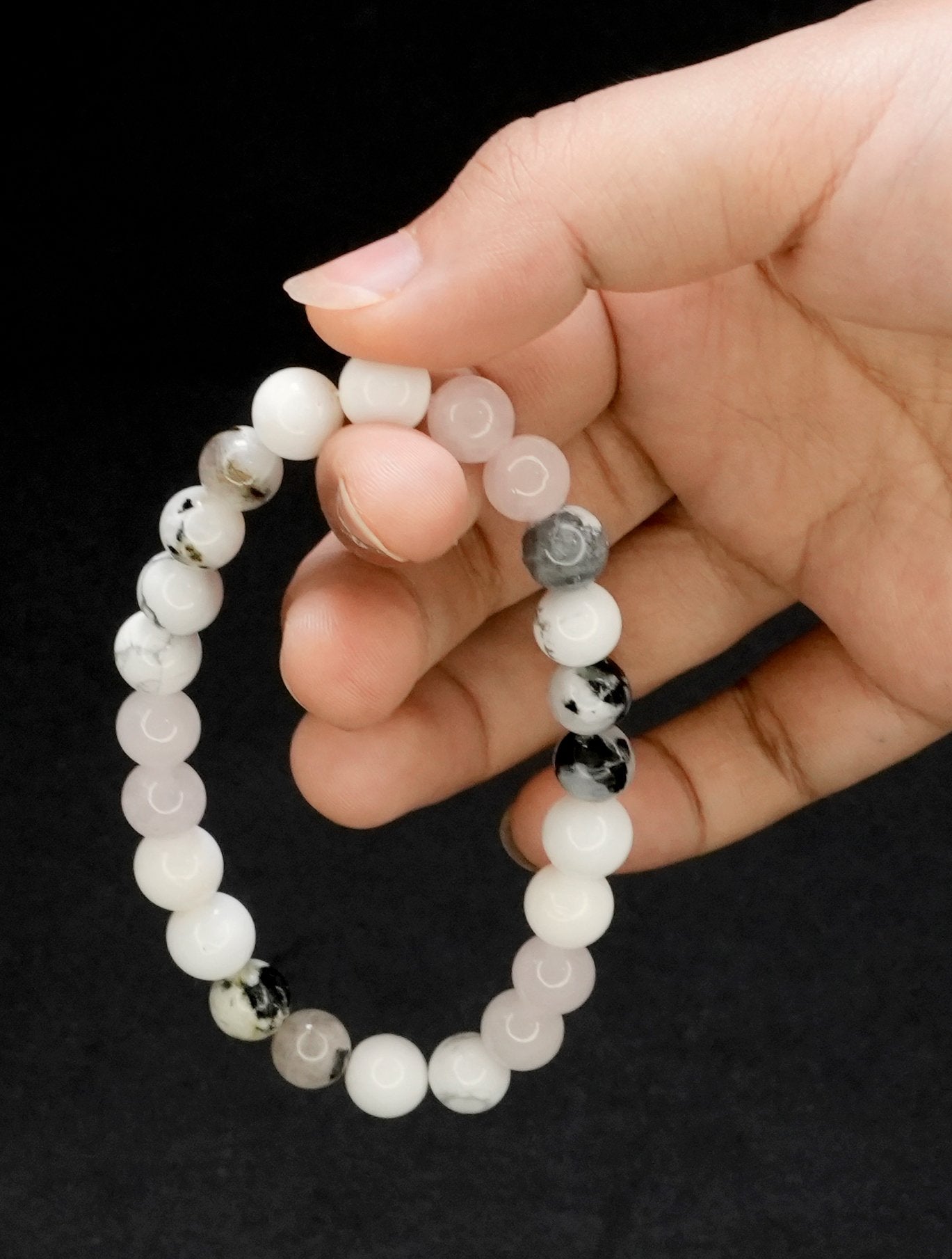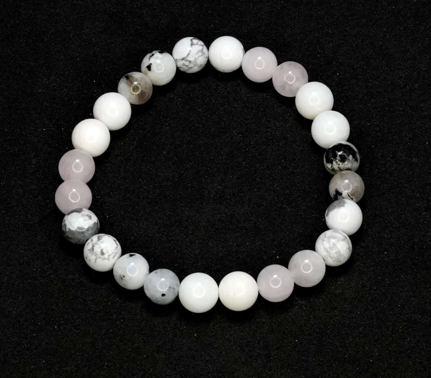Howlite: Howlite promotes deep relaxation and calms the restless mind. It encourages patience and helps express emotions clearly. \n Pearl: Pearls symbolize purity, wisdom, and serenity. They soothe emotional turmoil, support clear communication,. \n Rose Quartz: Known as the stone of unconditional love, Rose Quartz encourages self-love, emotional healing, and harmony in relationships. \n Moonstone: Moonstone enhances intuition and emotional balance. It promotes calmness, reduces stress. \n \n \n \nThis is just a spiritual support - its not meant to replace any medical advice or treatment.