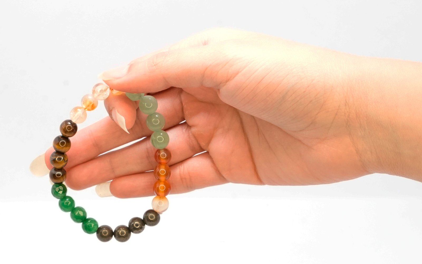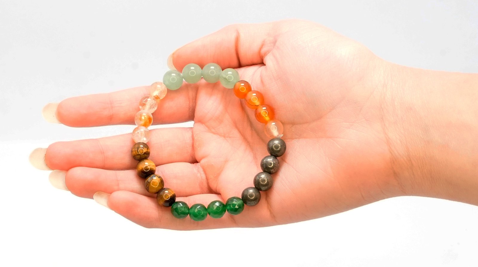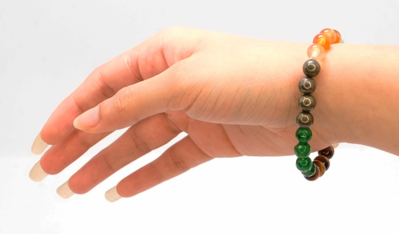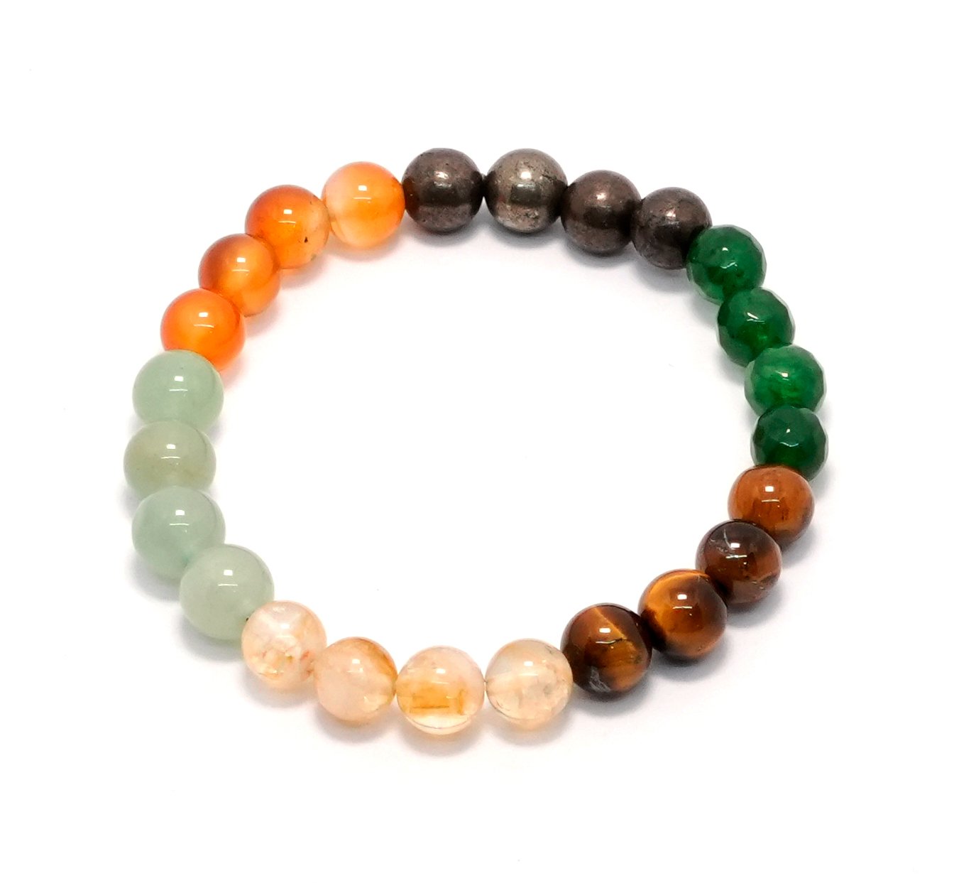 Green aventurine : Gently dissolves energetic blockages related to finances, encouraging growth, prosperity, and new opportunities. \nCarnelian : Radiates vibrant energy, fueling creativity, boosting confidence, and igniting passionperfect for bold pursuits and visionary ideas. \nPyrite: Often called Fools Gold,brings not only a sense of protection but also attracts prosperity and inner strength, making it a powerful ally for business ventures. \nCitrine : Is a stone of manifestation, drawing in success, abundance, and positive energy while dispelling negative thoughts and self-doubt. \nTigers eye : A grounding stone that instills luck, protects your wealth, and helps you make wise financial decisions with courage and clarity. \nGreen jade : Revered symbol of wealth, harmony, and good fortune, traditionally believed to bring long-term financial stability and abundance. \n \nThis is just a spiritual support - its not meant to replace any medical advice or treatment. \n \n